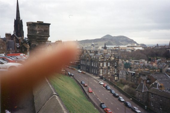 Yep, that’s Castle Rock right there, below the blurry finger tip. Taken from Edinburgh Castle carpark.