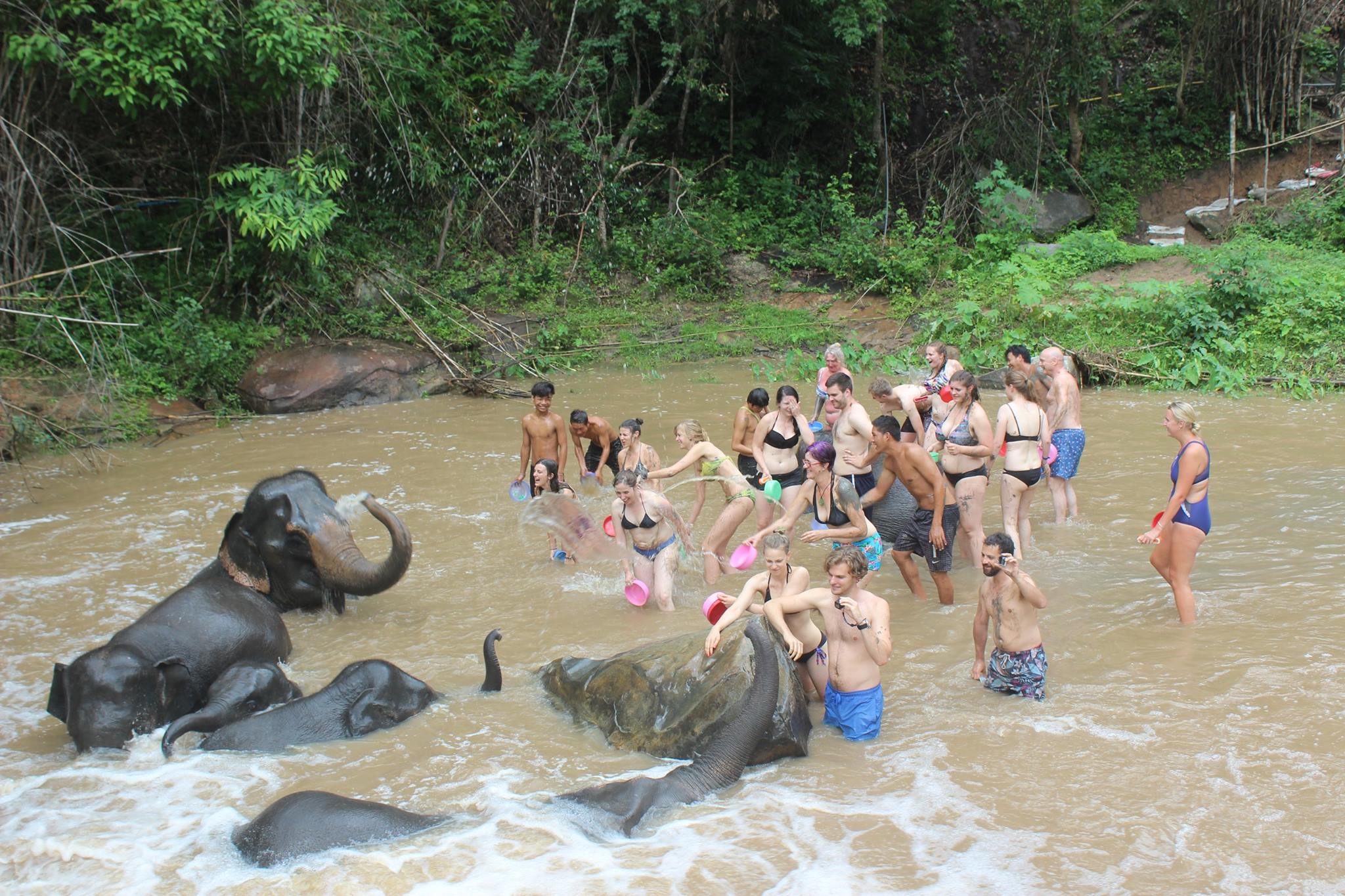 Elephant Jungle Sanctuary’s six camps house elephants that have been bought or raised by the local Karen people to save them from a life of harsh training, painful riding chairs, and being chained up. The EJS elephants are free to roam in their family groups, but their owners feed them daily to keep them in the area and prevent them from entering the rice paddies nearby. The owners love their elephants – you can clearly hear this in the voice of the young men talking to us. They teach them basic commands for a natural daily routine, and have peaceful people-tolerant animals. It’s all part of a cycle that works: the Karen owners couldn’t afford the vast amount of bananas, foliage and corn needed each day, if it weren’t for tourist dollars. We pay to come and help look after them and fund the food and ethical mission of EJS.