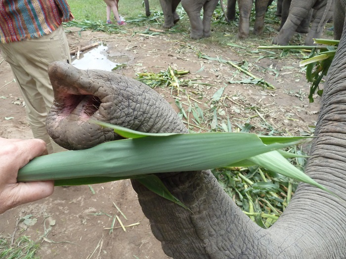 We were to shout ‘Bon bon!’ which alerts the elephant to raise it trunk, allowing a person to place a single banana directly in its mouth. But exploratory trunks went straight to our hands and snaked behind our backs to find bunches hidden there. It was exciting and stimulating being surrounded by these huge creatures, and nervousness evaporated as it became clear that they were quiet and calm in temperament. We next fetched large bundles of leafy corn stalks, which the elephants got stuck into for quite some time. Fascinating to watch the dexterous trunk twisting and snapping stalks, wrapping leaves, conveying them to the mouth which was already packed with a wad of greenery.