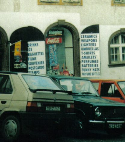 Note what useful items you can buy in this souvenir shop after parking your Lada. Baguettes and ceramics. Funny hats and amulets. Perfumes and ‘parfume bottles’. And weapons. You’re sorted.
